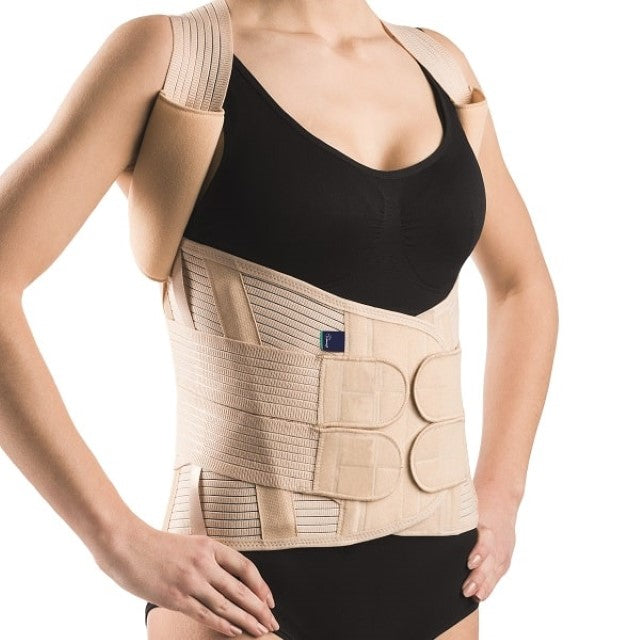 Aukštas krūtinės–juosmens–kryžkaulio įtvaras pagamintas iš orui pralaidaus ortopedinio kompresinio audinio. Dvi per pečius einančios juostos susikryžiuoja nugaroje ir tvirtinasi priekyje, todėl pečiai lengvai atstatomi, o stuburas stabilizuojamas visame krūtinės, juosmens ir kryžkaulio segmente. Priekyje įsiūtos lanksčios atramos leidžia laisvai judėti lenkiantis ar sėdint, o nugaroje esančios aliuminės juostelės kartu su minkšta pagalvėle suteikia tvirtą, bet komfortišką atramą.
