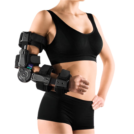 Alkūnės įtvaras su ROM sistema sudarytas iš standžios vienos ašies juostos ir patogios ergonomiškos rankenos, todėl patikimai stabilizuoja sąnarį, o ranką patogu laikyti reikiamoje padėtyje. Integruota ROM krumpliaraščio sistema leidžia tiksliai nustatyti rankos lenkimo (0–120°) ir ištiesimo (0–90°) kampus kiekviename reabilitacijos etape. Keturi paminkštinti Velcro dirželiai tolygiai apspaudžia žastą ir dilbį, o paminkštinta peties juosta saugo kaklą nuo spaudimo ir įbrėžimų. Įtvaro ilgis reguliuojamas 41–51 cm (56–66 cm su rankena), tad universaliai prisitaiko prie skirtingo ūgio ir rankos ilgio.