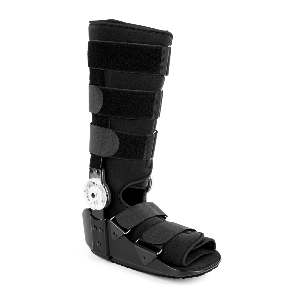 Kulkšnies–pėdos įtvaras su ROM sistema pagamintas iš tvirto polipropileno korpuso ir minkštų, kvėpuojančių vidaus sluoksnių. Pasukamas ROM lankstas leidžia tiksliai reguliuoti kojos lenkimo ir tiesimo kampus, todėl gydytojas gali palaipsniui didinti judesio amplitudę kiekviename reabilitacijos etape. Velcro juostos tolygiai apspaudžia pėdą, kulkšnį ir blauzdą, o neslystantis profiliuotas padas suteikia stabilų žingsnį net ant lygių paviršių.